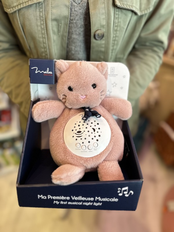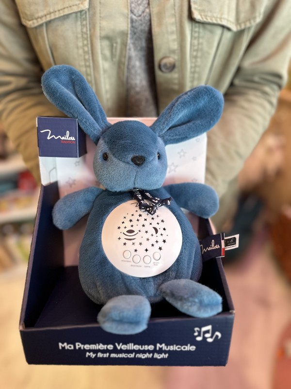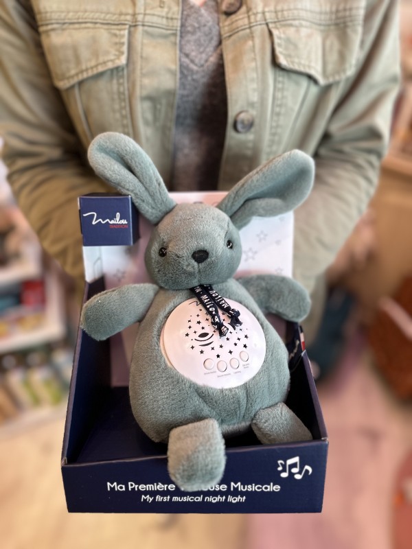 Mailou, c’est aussi des veilleuses. Des veilleuses lapins, chat ou renard, dans plein de couleurs super jolies. Veilleuse, mais également boîte à musique qui fait aussi des bruits blancs pour les tout petits. Elles existent dans plusieurs couleurs : vert, bleu, rose, moutarde, beige et terracotta.